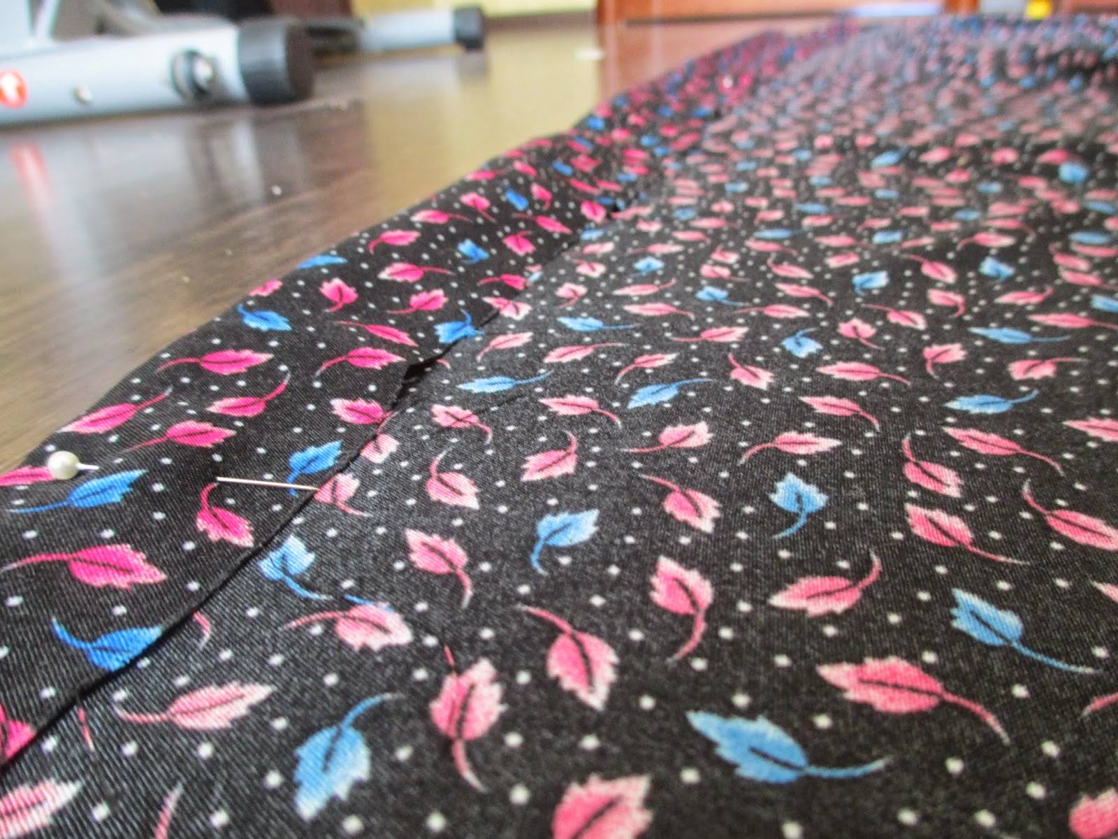 Раскладываем ткань и с одной стороны загибаем 2 см(у меня больше,так как ткань была неровной).Закалываем портновскими иголками.