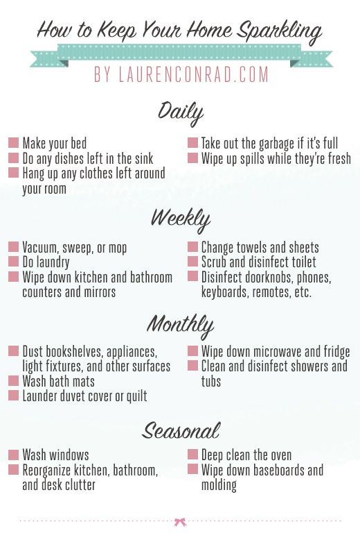 А напоследок хочется поделиться с вами по-моему очень полезным списком того,что нужно делать в своей комнате каждый день,неделю,месяц и сезон.Если выполнять все эти дела каждый раз,то комната непременно станет уютней и приятней глазу,а ваше настроение непременно будет лучше:)